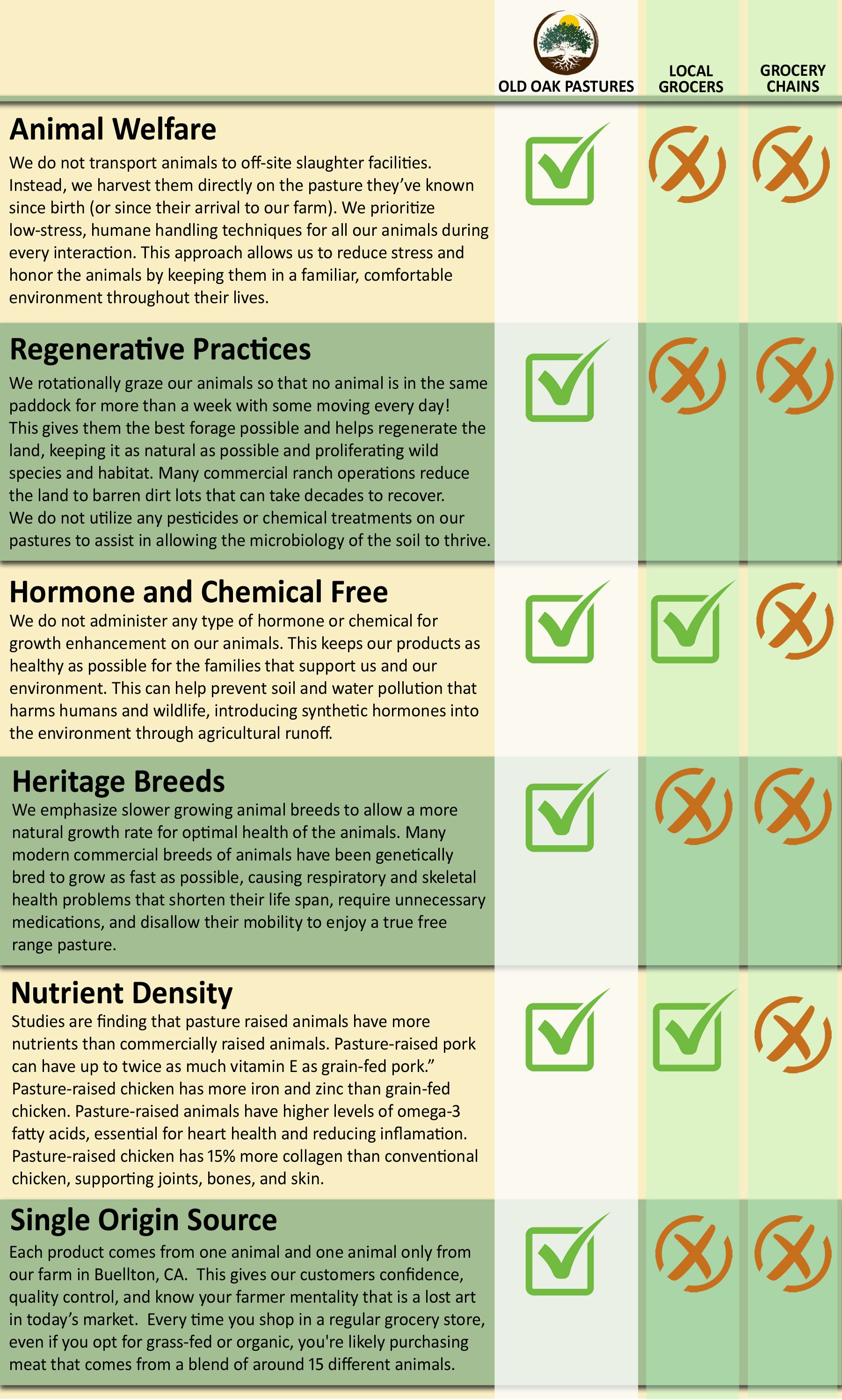 Each product comes from one animal and one animal only from our farm in Buellton, CA. This gives our customers confidence, quality control, and know your farmer mentality that is a lost art in today's market. Every time you shop in a regular grocery store, even if you opt for grass-fed or organic, you're likely purchasing meat that comes from a blend of around 15 different animals.