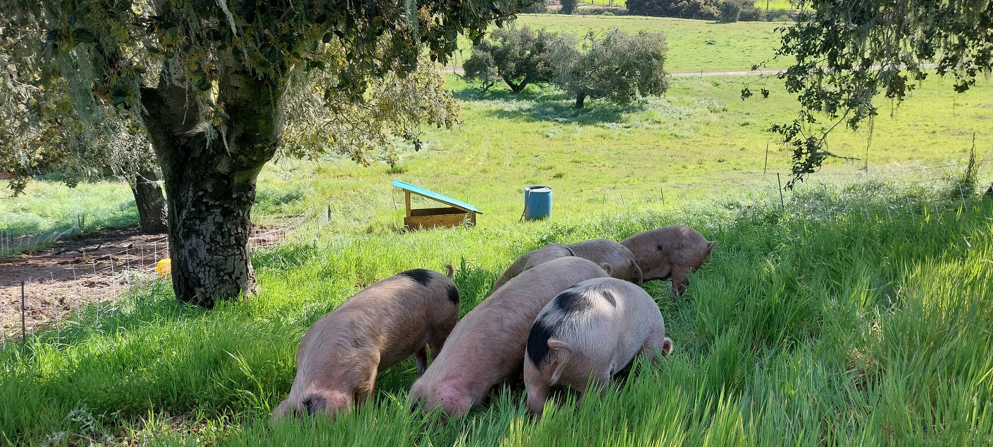 Our heritage breed pigs, Gloucestershire Old Spot, are supplemented with Organic, Non GMO feed and we rotate the pigs throughout different areas of the ranch to get them the best food possible. Here they live a stress free life enjoying all the nutritious snacks that nature has to offer. They get to forage as much as they want, every day of their lives at our 200 acre local family ranch in Buellton, CA.